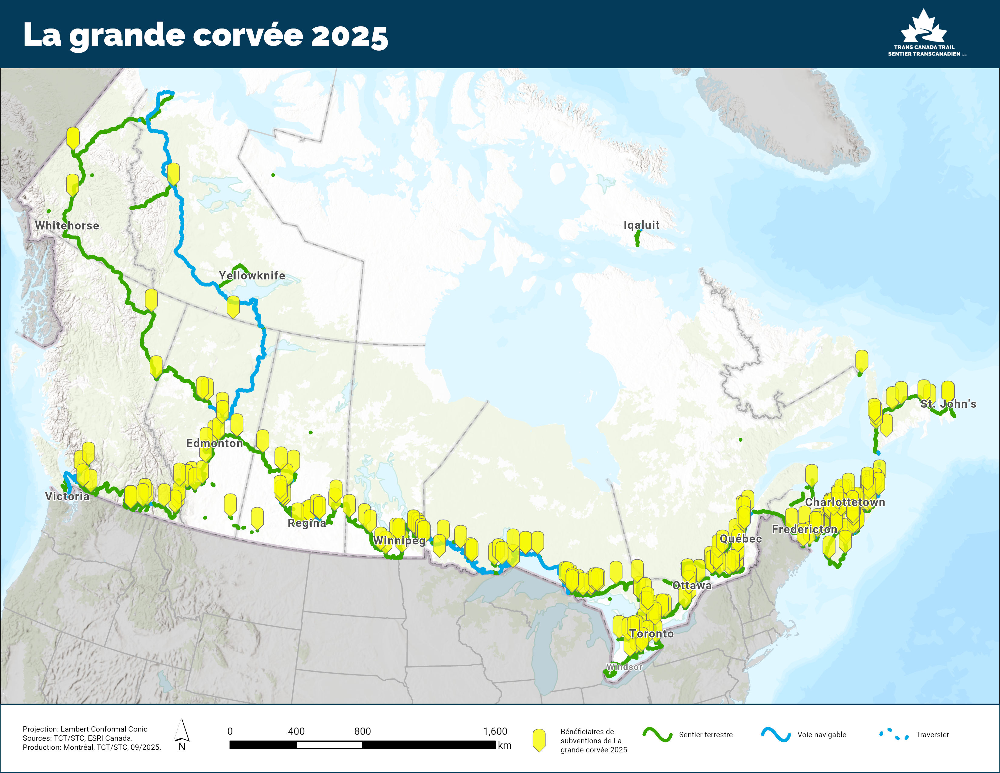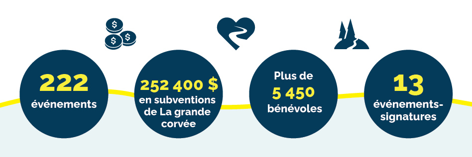 Cette année, Sentier Transcanadien a remis 252 400 $ en subventions de La grande corvée à des groupes communautaires partout au Canada, d’un océan aux deux autres, dans les 10 provinces et 2 territoires, pour aider des groupes locaux à préparer le Sentier Transcanadien au changement de saison et améliorer les sentiers dans leur communauté.